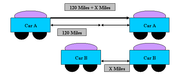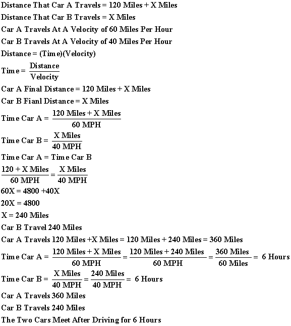 | The Original Distance Between Car A and Car B Was 120 Miles. Both Cars Travel in The Same Direction and On The Same Road. Car A Travels at a Rate of 60 Miles Per Hour. Car B Travels at a Rate of 40 Miles Per Hour. How Much Time Will It Take For Car A and Car B to Meet. What Distance Has Car A Traveled Before The Distance Between Care A and Car B is Equal to Zero Feet? What Distance Has Car B Traveled Before The Distance Between Car B and Car A Is Equal to 0 Feet? |
