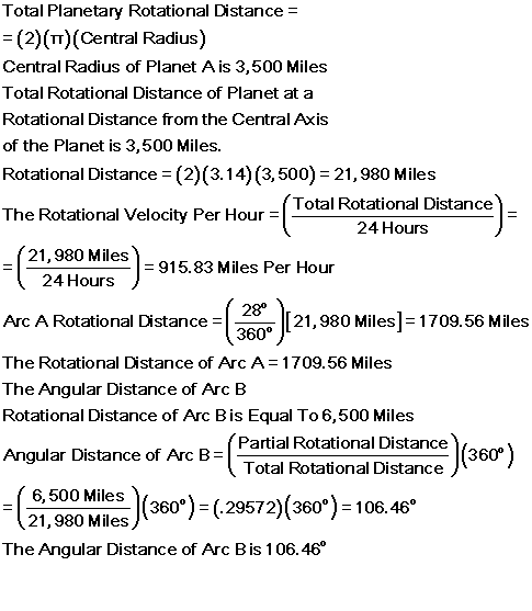 The Central Radius of the Planetary Disc is 3,500 Miles. The Rotational Distance of Radius Arc B is 6,500 Miles. What is the Total Rotational Distance of the Disc Considering That the Planetary Disc Radius is 3,500 Miles long. What is The Rotational Velocity For The Disc. What Is the Rotational Distance of Arc A If It Is 28°? What Is the Angular Distance of Arc B If The Planetary Disc Radius for Arc B is 6,500 Miles Long? |