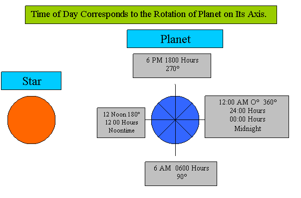 | We will examine how a planet's Angular Motion and Angular Velocity relate to the way that we interpret time with our watches. Our watches monitor the progress of the Angular Rotation of a Planet through 360 Degree Cycle. The following chart and table will show how to understand this. | |||||||||||